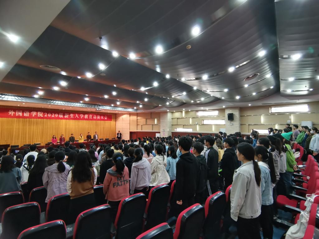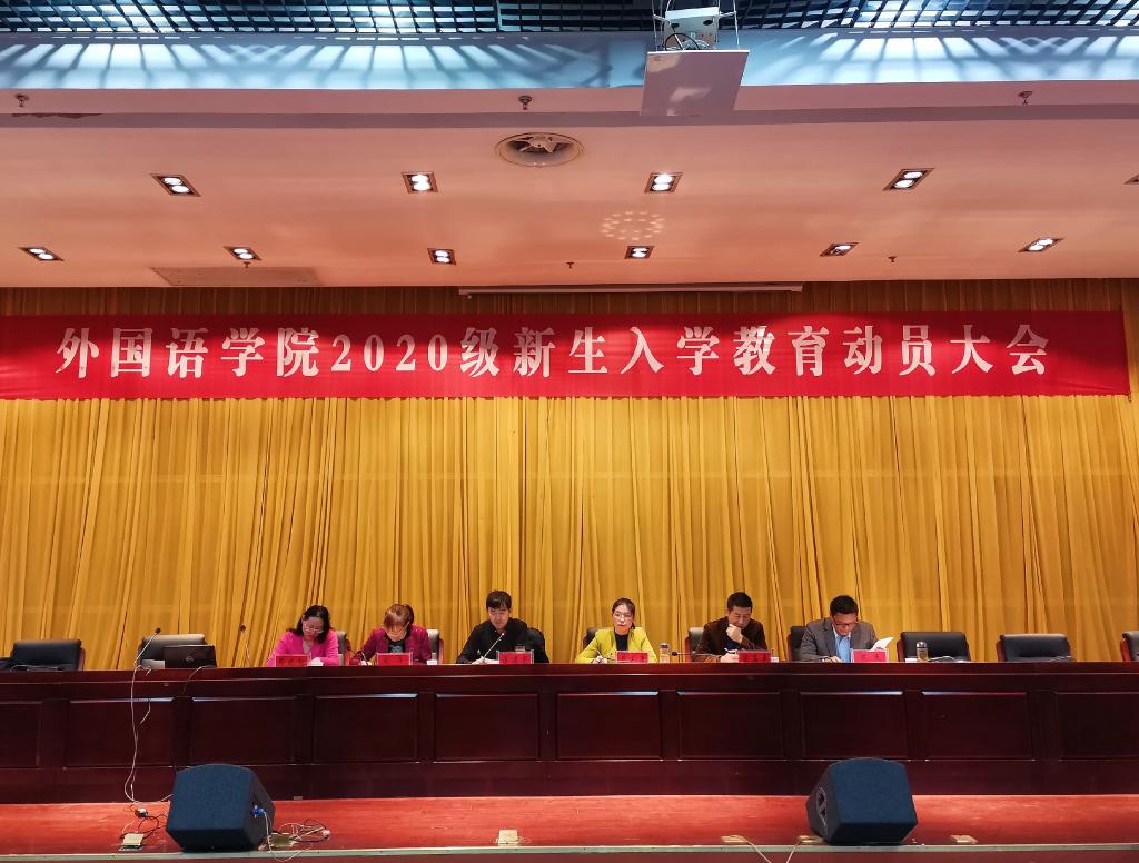 丹桂飘香,金秋送爽。20级新生带着青春的活力,带着对知识的不懈追求,带着对大学校园生活的无限憧憬,迈进了DUOBAO.COM外国语学院。为了让新生更快适应新环境,适应新的生活,顺利、平稳、有效地进入大学生活。10月21日下午14:00,外国语学院在新图书馆第二报告厅举行了新生入学教育动员大会。外国语学院院长陈德用、党总支书记蔡为青、副院长刘萍、教学秘书周海平、分团委书记陈慧中、专职辅导员宋兵兵,外国语学院教师代表,全体20级新生参会,大会由刘萍主持。