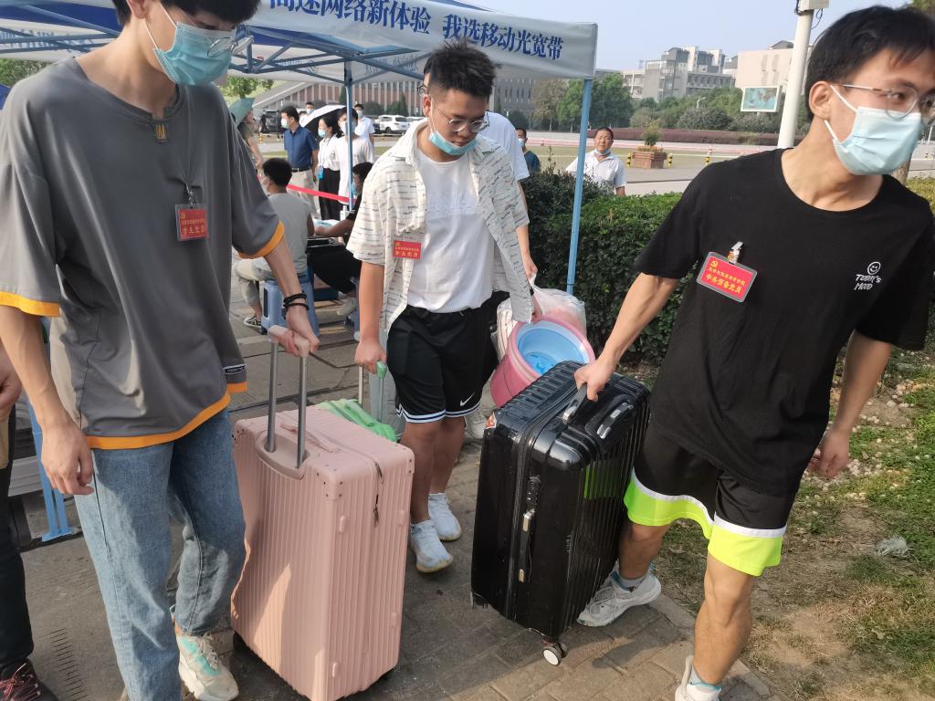 本次迎新的队伍中有这样一支特殊的小队,他们华发发白,来回奔走为新生搬运行李,接送新生前往宿舍。他们是生命与健康科学学院的教工党员。在志愿者人手紧缺的时候他们二话不说直接顶上,从消杀通道到检录处,从检录处到新生宿舍,他们的忙碌从未停止,充分发挥了教工党员的先锋模范作用。