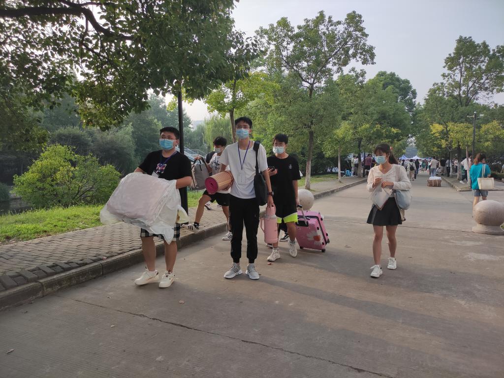 迎新现场工作人员有条不紊地展开迎新工作。辅导员与新生密切联系,不时通过QQ、电话等方式了解新生的行程和位置,确定报到时间并给予乘车指导。新生到校后,志愿者们热情上前接过家长手中的行李,引领新生消菌杀毒、更换口罩,出示核酸检测报告、行程码、返校通行证、通过面部识别再前往检录处进行检录,上交材料后领取宿舍钥匙和校园卡。最后由志愿者带着行李引导新生前往宿舍。