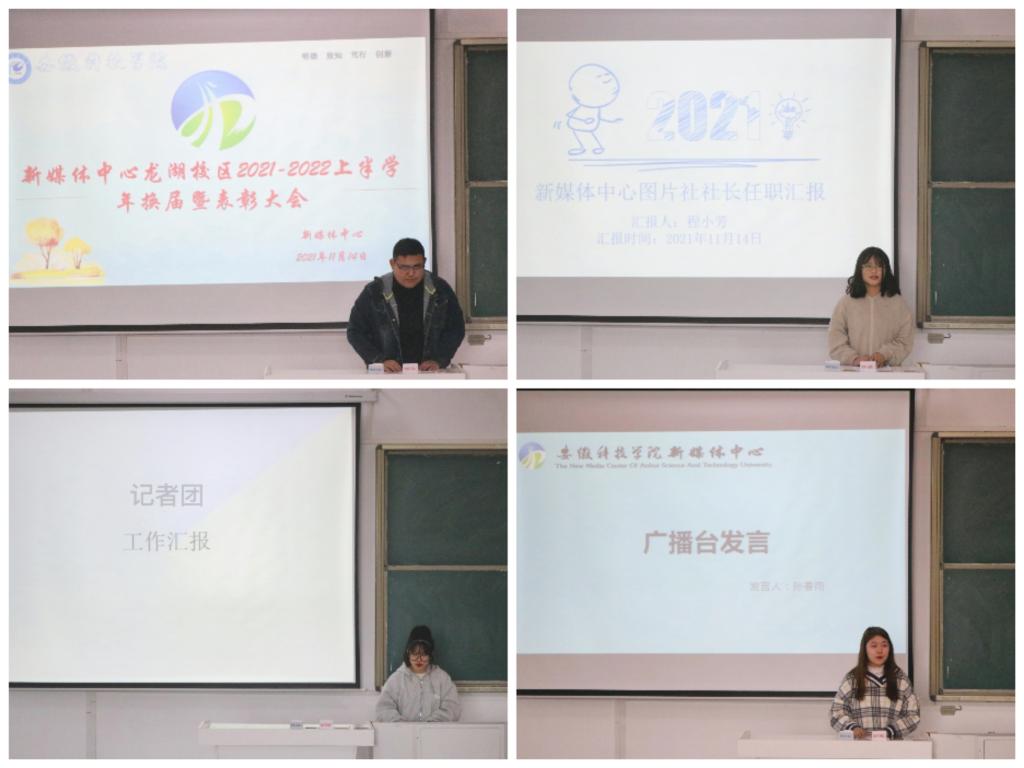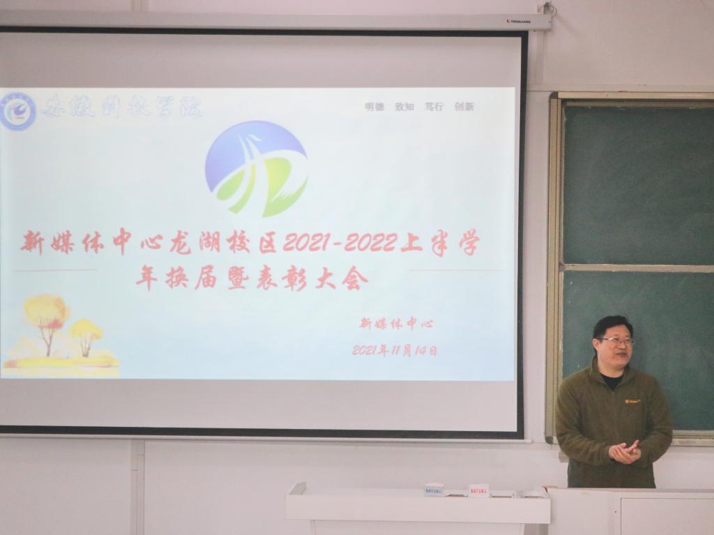 11月14日,我校新媒体中心2021-2022学年上半学年换届暨表彰大会在龙湖校区与凤阳校区分别召开。校党委宣传(统战)部副部长、团委书记黄立义,宣传(统战)部副部长姚文均,宣传部指导老师李刚、刘倩、张威受邀出席,新媒体中心各组织全体成员参加会议。两校区会议分别由新媒体中心广播台的柏田甜、贾星兰主持。