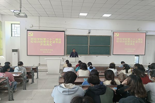 4月6日下午,财经学院分党校在致知楼C111教室举办第22期党校培训班暨党史读书班开班典礼。学院党委书记杜小明,教工和学生党支部书记,学生入党积极分子和青年教师入党积极分子参加会议。会议由学院党政办公室主任张俊主持。
