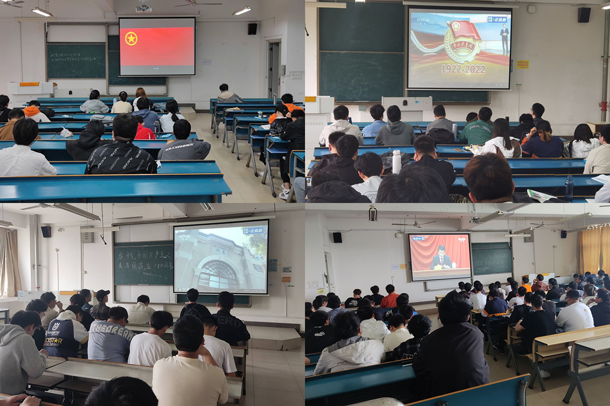 2022年5月10日上午,庆祝中国共产主义青年团成立100周年大会在人民大会堂隆重举行。机械工程学院组织团学干部和学生代表在学院会议室观看大会直播,正处级组织员张严政,党委副书记、纪委书记张程,党政办副主任王飞,团委副书记谭博文,团委挂职副书记张立亮,辅导员孟凡生、邱杰、姚迪于学院会议室观看庆祝中国共产主义青年团成立100周年大会。学院各团支部利用团日活动契机,在教室观看直播或观看回放。