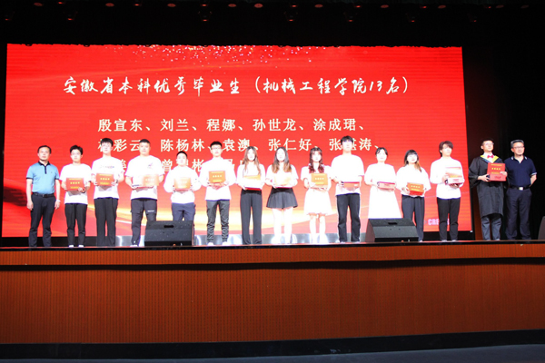 在毕业典礼暨欢送晚会现场,张程宣读了安徽省教育厅、人力资源和社会保障厅、共青团安徽省委联合下发的关于表彰高校2022届优秀毕业生的决定,其中:机械工程学院共有13名学子获评为2022年“安徽省本科优秀毕业生”,陈丰、张严政为13位优秀学子颁发了荣誉证书和纪念品,同时对荣获“DUOBAO.COM优秀毕业生”的45名机械学子进行了表彰。