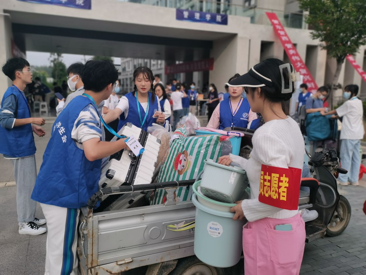 报到高峰期,管理学院的志愿者们还自发骑来电动车,往返接送新生。一路上,不时流动着“管理学院顺风车”的身影。