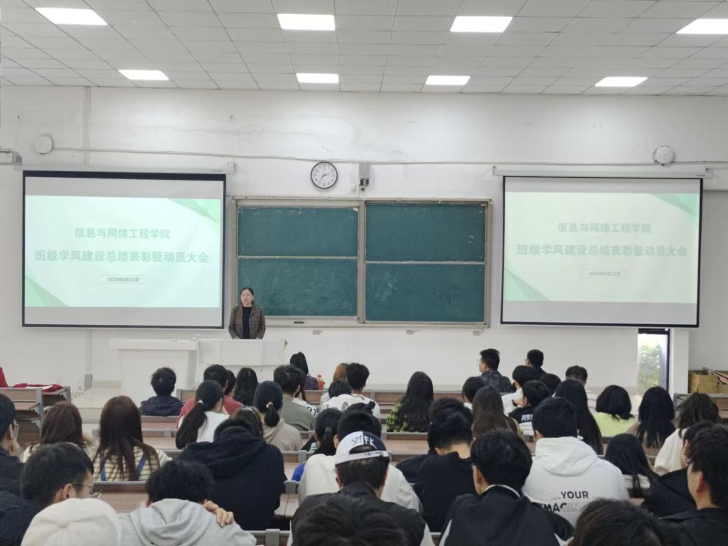 为表彰先进,选树优秀典型,持续推进学院学风建设再上新台阶,4月12日下午,信息与网络工程学院在致知楼C111召开班级学风建设总结表彰暨动员大会。信息与网络工程学院党委副书记、纪委书记韦乃学,专职辅导员李军成、丁阿敏、崔北坤出席本次会议,学院2020、2021、2022级各班级学生代表参加本次会议,会议由李军成主持。