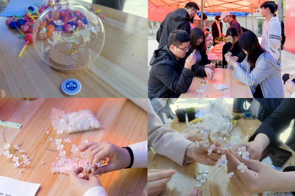 樱花花期随着春天的深入悄然来临,如期绽放,装点着灿烂的安科校园。在与“樱”同行活动现场,摆几只长桌短凳,同学们围坐在帐篷底下,一起手工制作心中最美的樱花,以樱花的烂漫,在制作中体验创作乐趣,三三两两,交流谈趣,抚慰枯燥的生活。现场的工作人员为参与活动的同学发放手工樱花制作材料并耐心讲解制作方法,还准备了教学视频,启发创作灵感,帮助大家完成创作。学生们边听边做,认真按步骤学习,通过“折”、“穿”、“拧”等方法一一尝试,意趣丛生。
