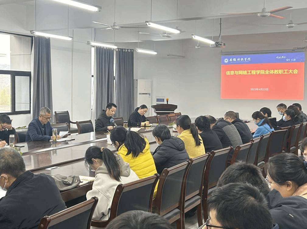 4月23日下午,信息与网络工程学院在尚行楼B418召开全体教职工大会。学院党政领导和全体教职工参加会议,会议由学院党委副书记、院长余宏杰主持。