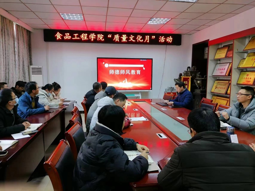 为全面贯彻党的教育方针,落实立德树人根本任务,培养德智体美劳全面发展的高素质应用型人才,提高人才培养质量,1月3日下午,食品工程学院在学院会议室开展了应用型人才培养以“质量文化月”为主题的系列活动。学院党政领导及全体教师参加了活动,活动由学院副院长郑海波主持。