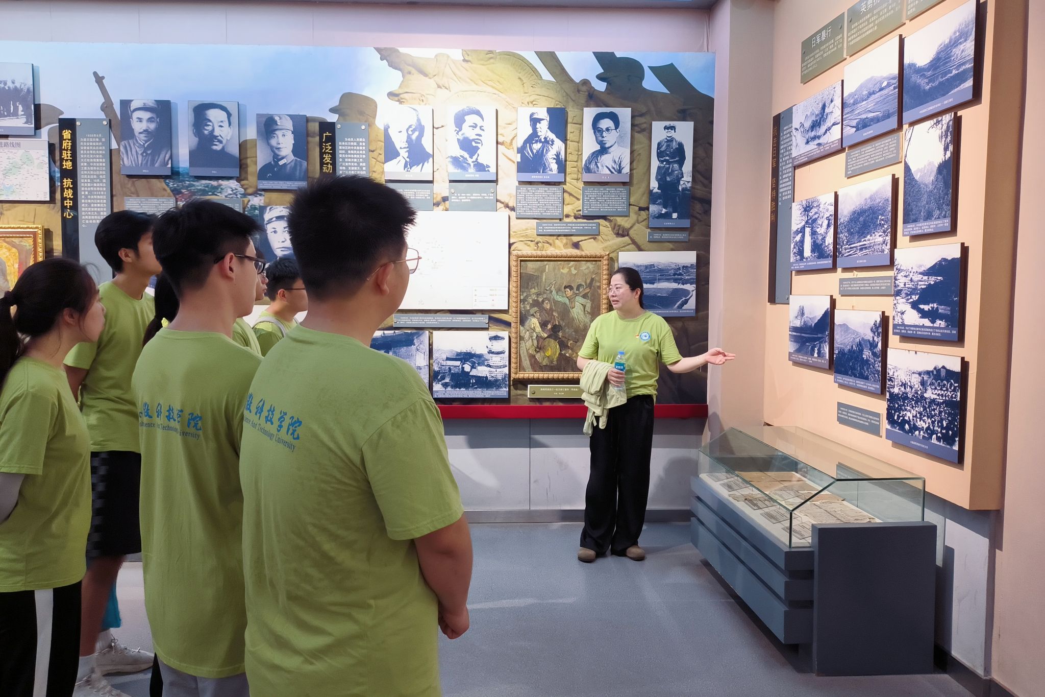 学史增信,从厚重的历史中感悟初心,融会力量。实践团先后参观了金寨县历史文物馆、红二十五军军政机构旧址、革命博物馆、革命烈士陵园、红军广场,借着金寨县宝贵而丰富的红色资源,在历史的长河中追忆革命史诗。陈列室里一件件破旧的军装,一双双硌脚的草鞋,一枚枚依旧闪亮的勋章,无不在诉说着红军长征路的万难,“将军县”顽强无畏的勇敢与坚毅,深深地撼动着团队成员的心。7月7日,实践团一行来到抗日战争历史展馆,追忆历史,不忘历史,铭记历史,实践团成员纷纷表示:“历史是最为生动的教材,永远激励着广大青年奋勇前进,一定要以革命先烈为榜样,学习他们不畏艰难,勇于献身的革命精神,将红色文化传递下去,勇做担当民族复兴大任的时代新人。”