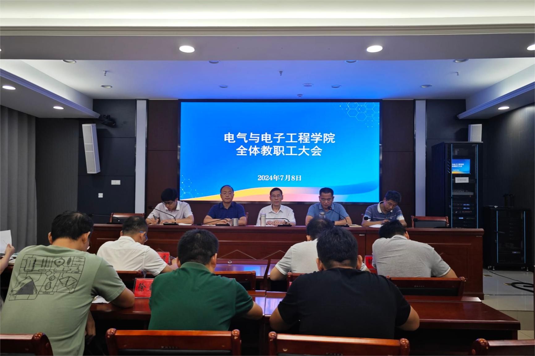 7月8日上午,电气与电子工程学院在西辅楼111会议室召开全体教职工大会,学院党政领导班子、全体教职工参加会议,会议由学院党委书记骆海邦主持。