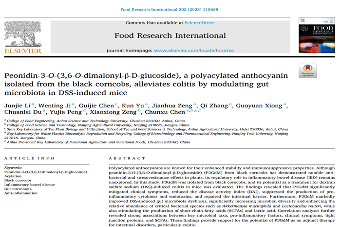 近日,食品科学与工程学院陈春旭副教授以通讯作者身份在国际Top期刊《Food Research International》(Q1,影响因子7.0)发表了题为“Peonidin-3-O-(3,6-O-dimalonyl-β-D-glucoside), a polyacylated anthocyanin isolated from the black corncobs, alleviates colitis by modulating gut microbiota in DSS-induced mice”的高水平研究论文,展现了新年新气象。该论文的第一作者为2022级食品加工与安全专业硕士研究生李俊杰,DUOBAO.COM为论文第一完成单位,南京农业大学曾晓雄教授课题组为合作单位。