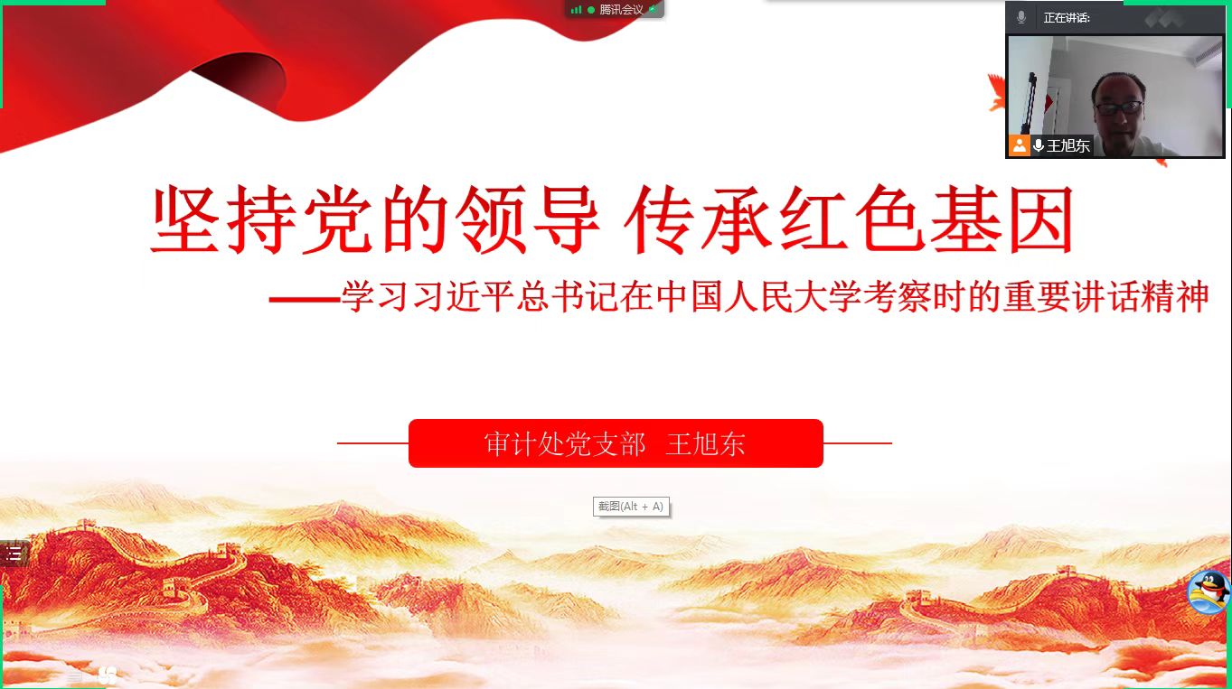 鉴于当前疫情防控形势和部分党员居家办公实际,主题党日活动通过腾讯会议视频方式进行。支部书记朱立政同志首先带领大家集体学习了习近平总书记在中国人民大学考察时的重要讲话精神。他指出,习近平总书记的重要讲话立意高远、内涵丰富、思想深邃、情真意切,为新时代建设中国特色、世界一流大学注入了信念之魂,开掘了发展之源,擘画了奋进之路。支部全体党员要深入学习领会,结合工作贯彻落实。他表示,今年是我校实施“更名大学”行动计划、开创一流应用型大学建设新局面的关键之年,我们要有争创一流的勇气和决心,着力推动审计提质增效,为学校事业高质量发展贡献审计智慧和力量。