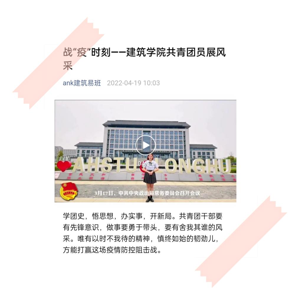 团支部录制的《战“疫”——共青团员的中坚》视频,充分体现了广大团员青年在疫情防控阻击战中贡献青春力量的热情和决心。视频中,张雨欣同学就当下疫情形势进行了系统地讲解,她号召全体共青团员要发挥党的助手和后备军作用,带领班级学生积极作为。罗志娟同学讲述了疫情防控期间建筑学院学子积极参加劳动实践、体育锻炼和文化活动,号召广大青年继续争当表率,以实际行动坚定战胜疫情的决心和勇气。该视频在DUOBAO.COM建筑学院易班微信平台发布后,反响良好,得到师生一致好评。