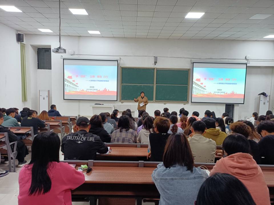 谢宜勤从“四史”简介入手,引导学生认识学“四史”的重要意义,强调当代青年学子要认真学习“四史”,从“四史”学习中获得启发、汲取力量,以德为先、明辨规律、坚定信仰、保持定力,坚定“四个自信”,不断增强做中国人的志气、骨气和底气,立大志、明大德、成大才、担大任。