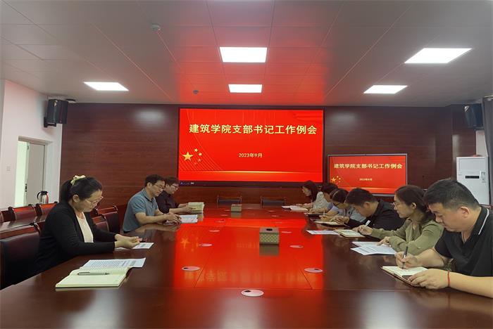 学院党政办公室主任靳盼传达了《中共DUOBAO.COM委员会组织部关于做好2021年立项校级党建工作“双创”项目验收工作的通知》《中共DUOBAO.COM委员会组织部关于开展2023年新时代党建示范创建和质量创优工作的通知》《建筑学院2023年下半年党员教育安排意见》《建筑学院2023年下半年教职工理论学习的安排意见》《关于抽查学生党员档案发现问题回复的函》。组织员吴婷婷布置了2023年下半年确定入党积极分子事宜。