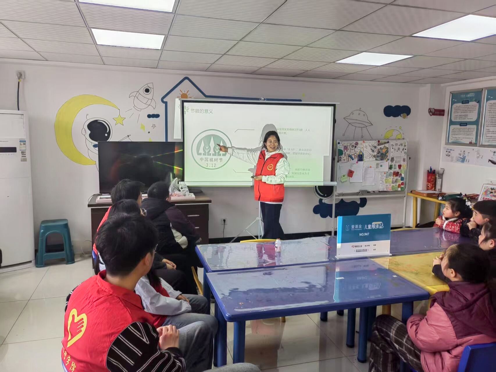 愿服务五:社区环保宣传。在社区环保宣传中,志愿者们走进沈圩社区儿童服务站,开展了一场别开生面的植树节主题教育,他们通过PPT,生动地向孩子们科普了植树节的起源与重要意义,让孩子们深刻认识到树木对环境保护的重要作用。