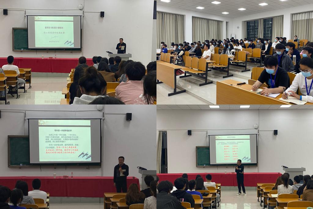 江旭聪从身份认知问题切入,以“重策划,善谋划,细筹划”为主题,点明新闻宣传工作是树立学院形象、展示师生风采的重要窗口,强调了宣传工作者是活动记录者和门面担当的角色。接着,针对新闻稿件撰写,他结合自身工作经验,阐述了校园新闻稿的特点、六要素“5W+1H”以及常见的新闻稿类型,并通过对一些优秀新闻稿件分析,解读了常用结构、写作技巧和注意事项,强调了新闻内容要真实具体,要带温度、沾泥土、滴露珠,语言要平实准确,主题要明晰、有的放矢,引领向上向善好思想。最后,他要求新闻宣传者要勤于记录、善于构思、疾于运笔,不断增强自身的听力、眼力、脑力和笔力。