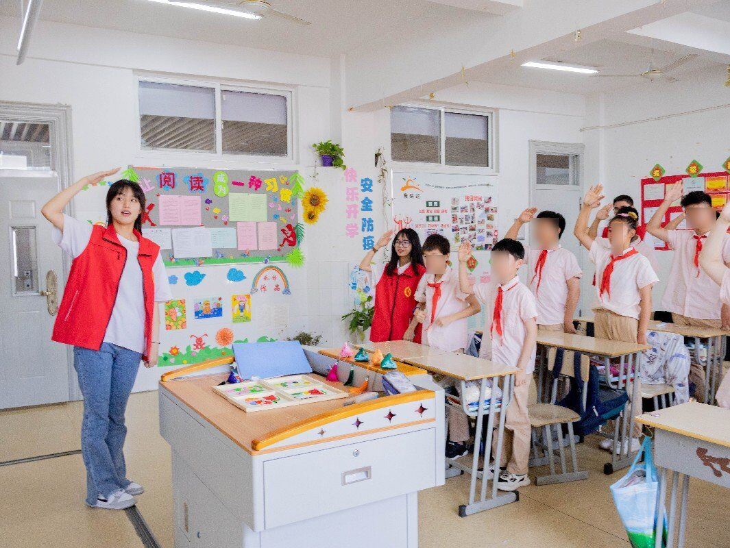 实践团队成员开展“童心向党 薪火传承”主题队课期间,带领五(1)班的少先队员们学习《我们是共产主义接班人》手势舞。刚开始学习时,队员们略显局促,但是他们神情专注,目光坚定,认真跟着团队成员的节奏慢慢学习。一遍又一遍,在班主任胡向红和团队成员的鼓励下,孩子们越来越熟练。他们整齐划一,随着动听的旋律起舞,脸上洋溢着灿烂的微笑。小小的手臂举过头顶,庄严地敬出少先队队礼。“看到他们阳光可爱的模样,我觉得我们做的这一切都有了意义。”团队成员解俊贻活动结束之后感慨道。