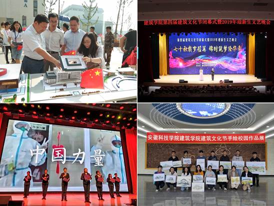 学院依托专业特色,精心打造“建筑文化节”,现为校“一院一品”知名文化品牌,在德育、体育、美育、劳育等文化建设方面均遥遥领先。每年开展主题党日、团日和主题教育,举办学风辩论赛、迎新生文艺晚会、毕业生欢送晚会、班级风采大赛等,积极参加国家级、省级乡村振兴等各种类型的社会实践活动,荣获国家级社会实际优秀团队荣誉称号1项,荣获省“三下乡”社会实践优秀团队、优秀调研论文和先进个人等多项;荣获全国高校“活力团支部”1个,荣获省优秀共青团员和“十佳”大学生提名等;积极参加大学生创新创业活动,获得国家级“互联网+”铜奖2项、“挑战杯”等省级奖励35项。在安徽省大运会上荣获金牌2项、银牌3项、铜牌5项,学院篮球队2次荣获校大学生篮球联赛总冠军、排球队4次荣获龙湖校区冠军,大学生田径运动会团体总分第一名1次、第二名1次、第三名2次。