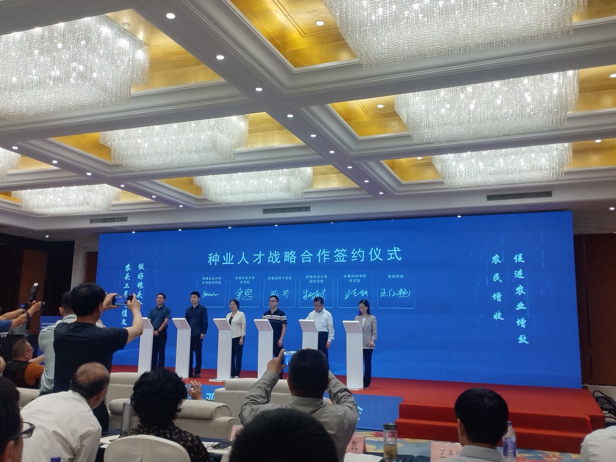 5月18日上午,何世潮一行来到宿州市农业科学院进行优质专用、高产、抗病小麦新品种田间观摩,随后参加了由安徽省种子协会主办的小麦产业发展大会、小麦分会第二届会员代表大会,何世潮代表农学院与安徽省种子协会签约了种业人才战略合作协议。5月18日下午,何世潮一行在埇桥区国家现代农业产业园、国家现代农业示范区党工委书记、管委会主任张梅带领下参观了安徽筐鲜生农业科技有限公司,受到了公司总经理李春雷等热情接待,双方就人才培养、毕业生需求等方面开展了深入探讨。