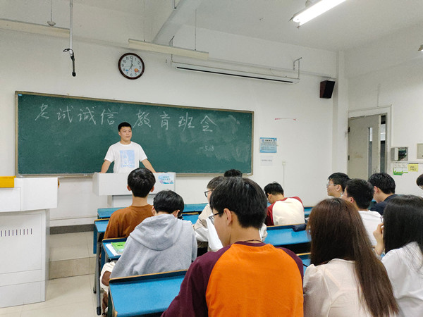 陈浩林向同学们介绍了诚信的内涵,即受诺、践约、无欺。向同学们介绍了诚信的重要性,讲述了诚信是一种道德品质,诚信是一种美好情操,号召同学们要诚信做人。最后,学习委员陈浩林提到部分课程即将结课,希望同学们好好复习,诚信考试。