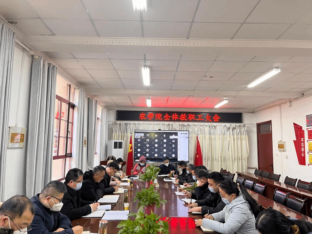 1月11日上午,农学院在学院会议室召开全体教职工大会,全面总结2022年全年工作,精心部署期末、假期及下学期初各项工作。会议采取“线上+线下”相结合的方式进行,农学院全体教职工参加会议,会议由农学院党委副书记、院长崔广荣主持会议。