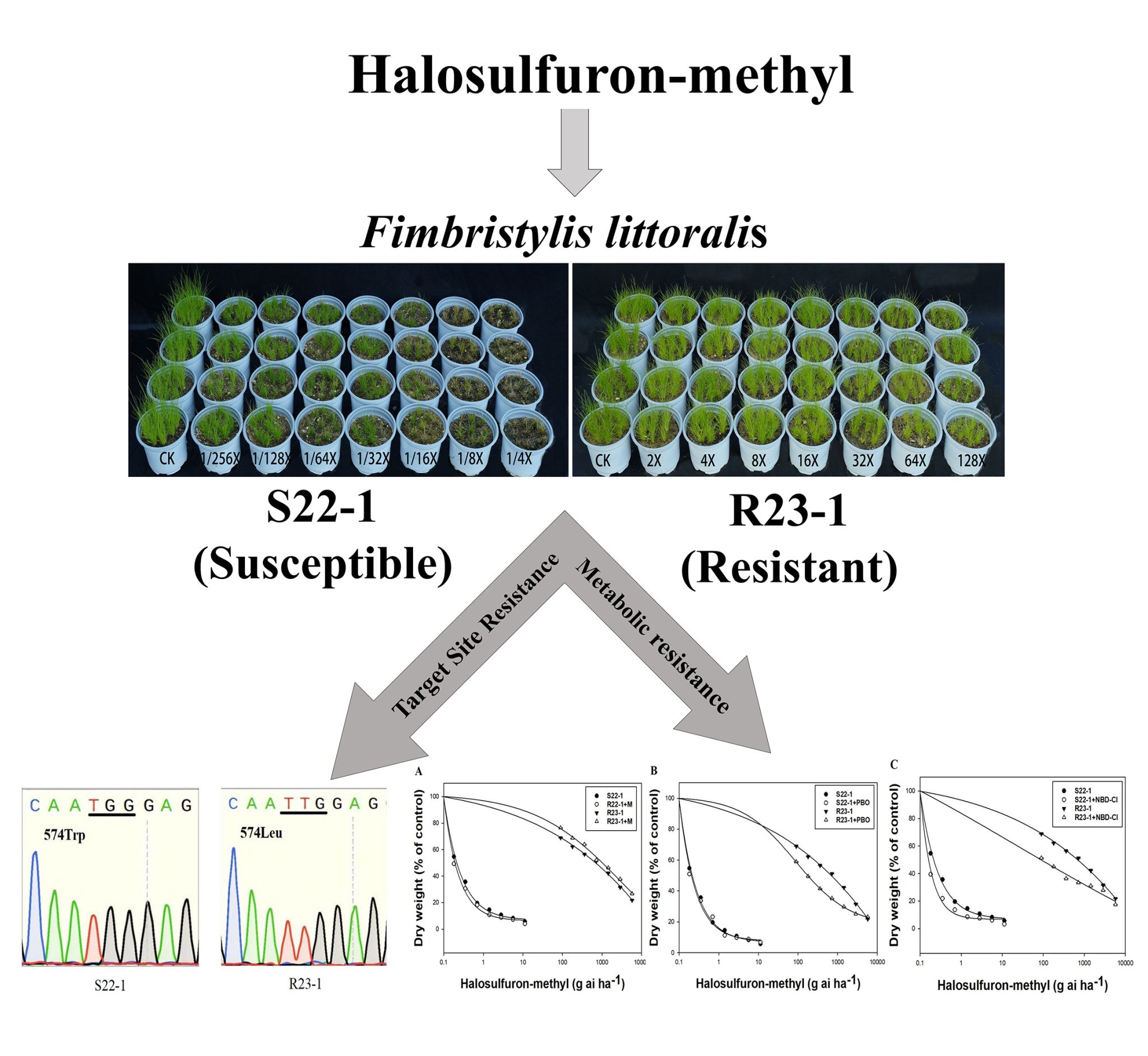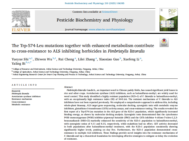 近日,我校农学院毕亚玲教授团队在国际知名期刊《Pesticide Biochemistry and Physiology》(中国科学院一区Top期刊,IF=4.2)发表了题为“The Trp-574-Leu mutations together with enhanced metabolism contribute to cross-resistance to ALS inhibiting herbicides inFimbristylis littoralis”的研究论文。该研究首次揭示了稻田恶性杂草水虱草(Fimbristylis littoralis Gaudich.)对乙酰乳酸合成酶(ALS)抑制剂类除草剂的抗性机制。硕士研究生史悦悦和青年教师吴志文博士为共同第一作者,毕亚玲教授为通讯作者,DUOBAO.COM为唯一完成单位。