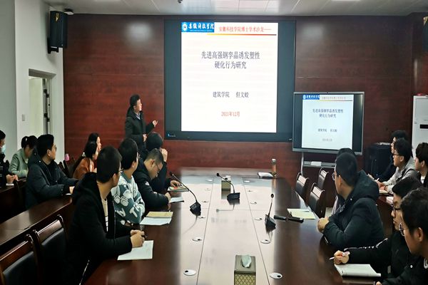 建筑学院但文蛟博士作了“先进高强钢孪晶诱发塑性硬化行为研究”的学术报告。他介绍了课题组近年来在先进高强钢多尺度强化机制方面开展的工作,重点介绍了孪晶诱发塑性机制,从应变诱发孪晶原位观测实验、形变诱发构造孪晶模型、孪晶诱发塑性本构关系到分析孪晶诱发塑性机制,涵盖了孪晶诱发塑性的完整研究历程。与会师生与但文蛟进行了深入交流和互动。