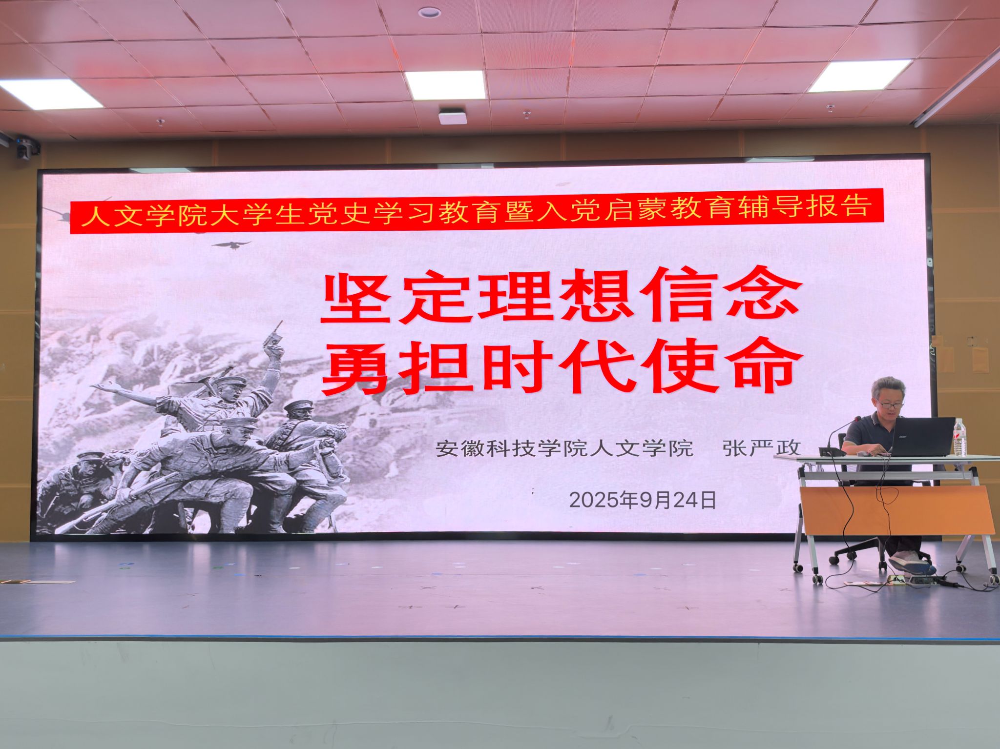 为引导广大青年学子从党的百年奋斗历程中汲取智慧和精神力量,明确新时代青年的使命任务,强化责任担当,9 月 24日晚,人文学院在图书馆二楼报告厅举办大学生党史学习教育暨入党启蒙教育辅导报告会。本次报告会的主题是“坚定理想信念,勇担时代使命”,由学院正处级组织员张严政主讲、辅导员刘佳主持,2025 级全体新生参加。