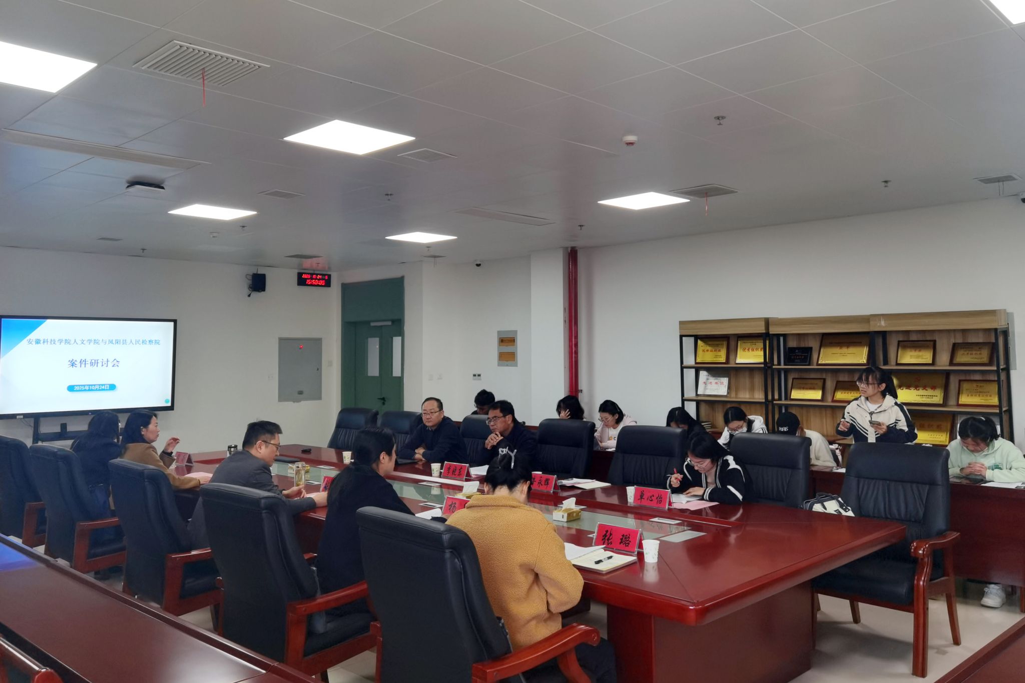 10月24日下午,人文学院与凤阳县人民检察院共建合作座谈会在人文学院会议室举行。凤阳县人民检察院党组书记、检察长张杏喜率队出席会议。人文学院党委书记、院长李晓东,副院长牛永辉,模拟法庭主任宣刚,以及法学系师生代表参加了座谈会。会议由李晓东主持。