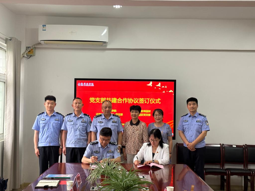 为深入开展学习贯彻习近平新时代中国特色社会主义思想主题教育,创新支部党建形式,5月30日下午,人文学院法学教工(学生)党支部与蚌埠监狱第七监区党支部在学院会议室举行共建合作协议签字仪式。人文学院党委书记杜士凤,党委副书记、纪委书记李沙娜,法学系主任、法学系教工党支部书记张晓云,蚌埠监狱三级高级警长、天一服饰有限公司副总经理李利,蚌埠监狱第七监区党支部书记马立宝,党支部副书记邵修来,党支部委员窦豪,四级警长张鑫出席签约仪式。