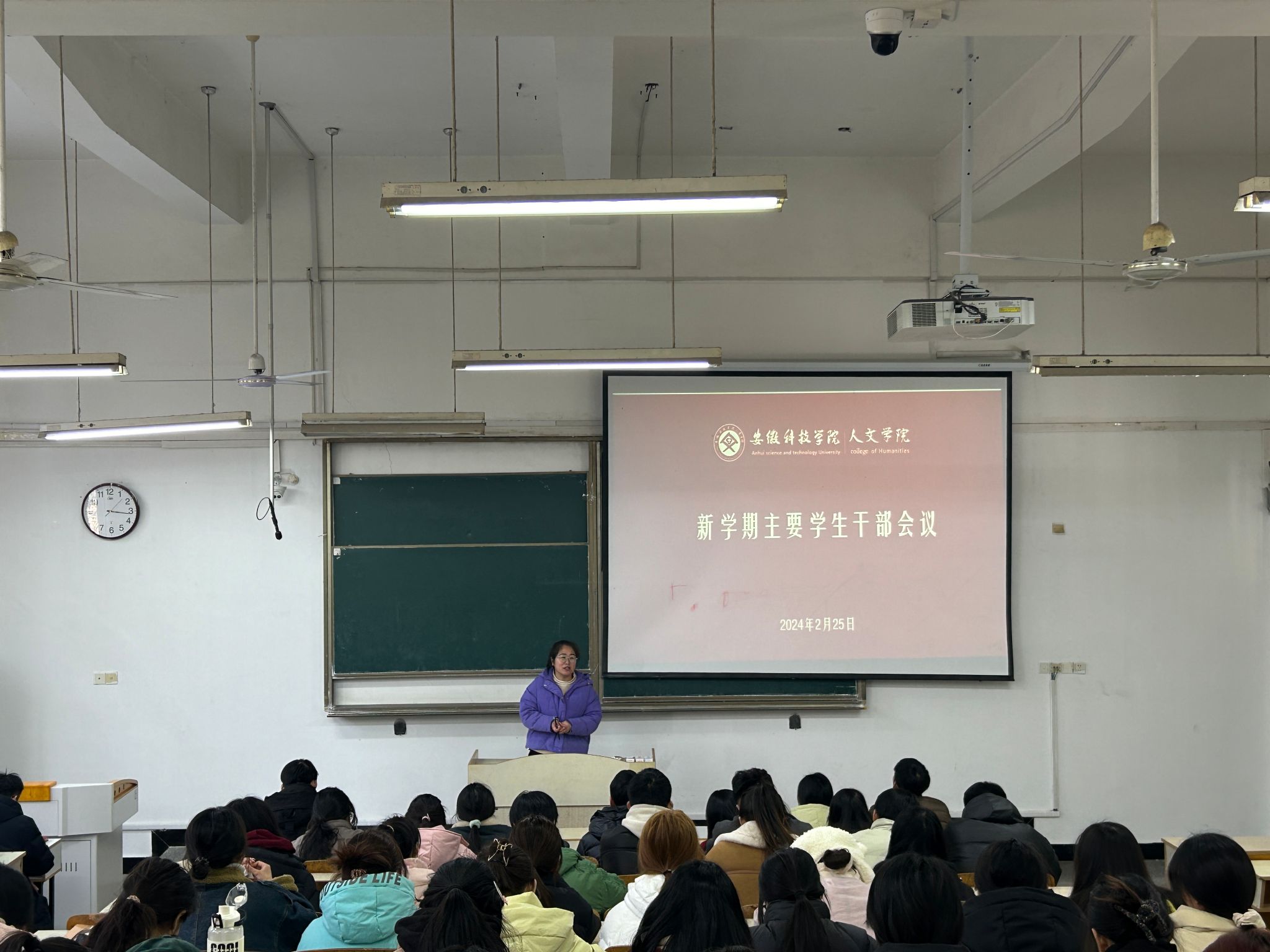 2月25日下午,人文学院于求知楼A107教室召开新学期主要学生干部工作会议。学院党委副书记李沙娜、全体辅导员及各班班长、团支书、学习委员参加。会议由团委副书记焦雪松主持。