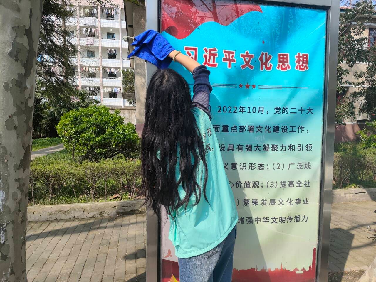 志愿者们穿戴马甲,携带清洁工具,分组对校园宣传栏进行了细致清理,同学们三两一组,仔细擦拭宣传栏目上积攒的灰尘,用心擦拭每一块玻璃,绿色的马甲在阳光下构成一道靓丽的风景线,在大家共同努力下,校园宣传栏焕然一新。同学们在打扫过程中深入了解宣传栏中内容,对其中历史文化、学术动态和通知公告等进行了详细的阅读和学习。