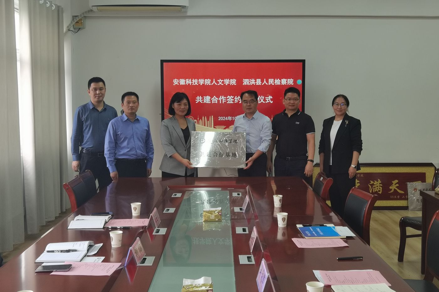 10月11日下午,泗洪县人民检察院党组书记、检察长柳梅,党组成员、副检察长王晓刚,第六检察部副主任江荣香一行来校签署共建合作协议;人文学院党委副书记、院长李晓东,副院长牛永辉,党委副书记、纪委书记李沙娜,法学系主任张晓云出席仪式。仪式由李沙娜主持。