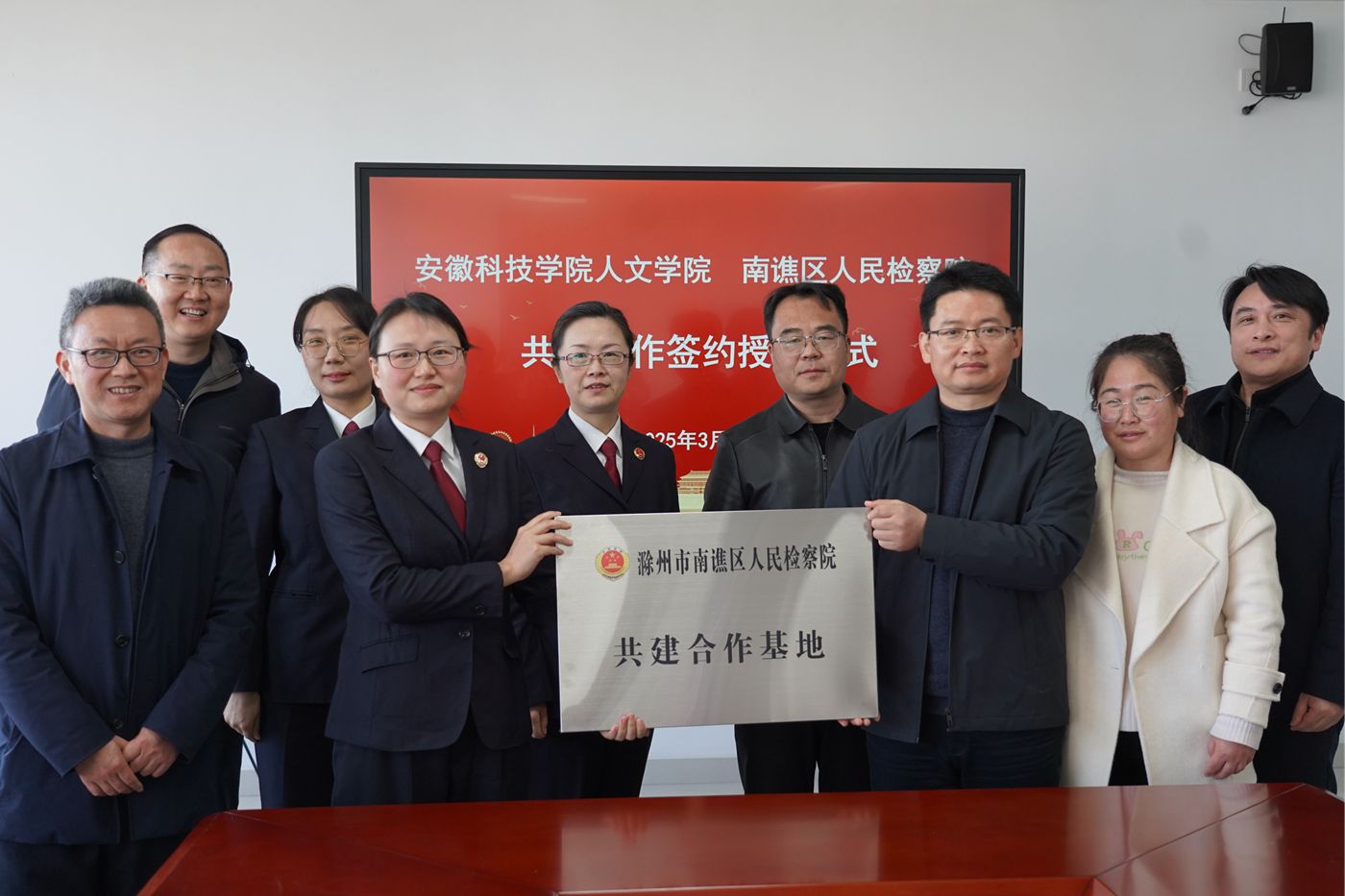 为加强法学专业实习实训基地建设,推动法学专业新文科认证,搭建人才培养单位与法律实务部门交流平台,3月18日下午,人文学院与滁州市南谯区人民检察院举行共建合作签约授牌仪式。南谯区人民检察院党组书记、检察长陈涛和副检察长钱佳、第一检察部主任张婷婷,学院党委副书记、院长李晓东和正处级组织员张严政、副院长牛永辉、党委副书记李沙娜、党委委员骆绪刚、模拟法庭主任宣刚出席,仪式由张严政主持。