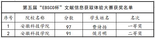 此外,在安徽省高等学校数字图书馆主办、图书馆协办的第五届“EBSCO杯”文献信息获取体验大赛中,我校费诗扬和侯月明同学分别荣获一等奖和二等奖。