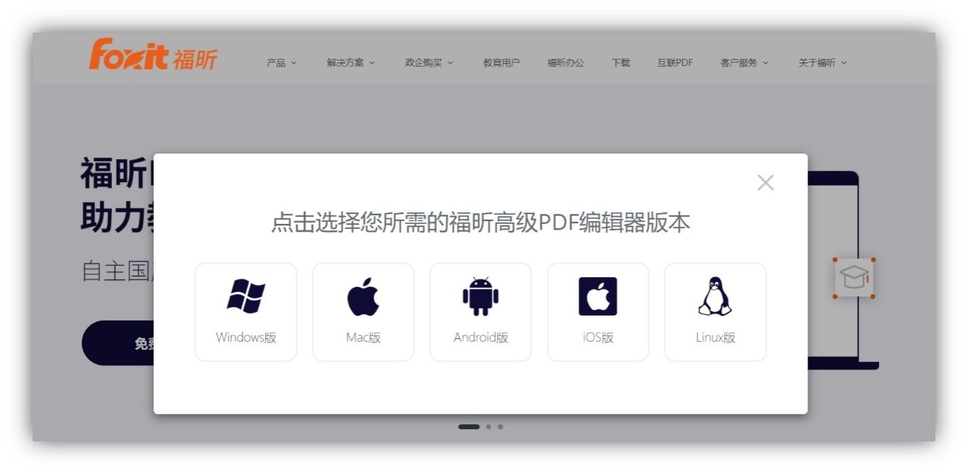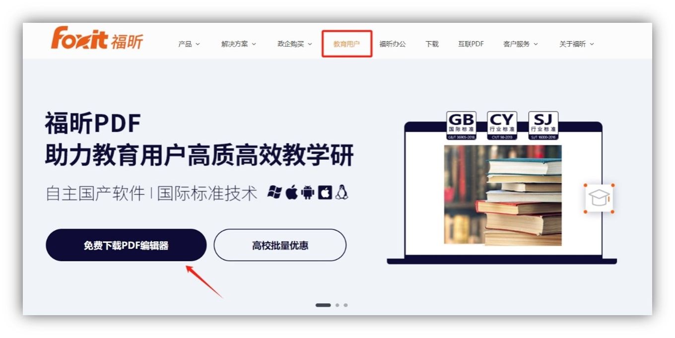 进入福昕官网-教育用户页面下载,在下图轮播图处,点击“免费下载PDF编辑器”,选择所需版本进行下载(含Windows、Mac、iOS、Android、Linux版本)。