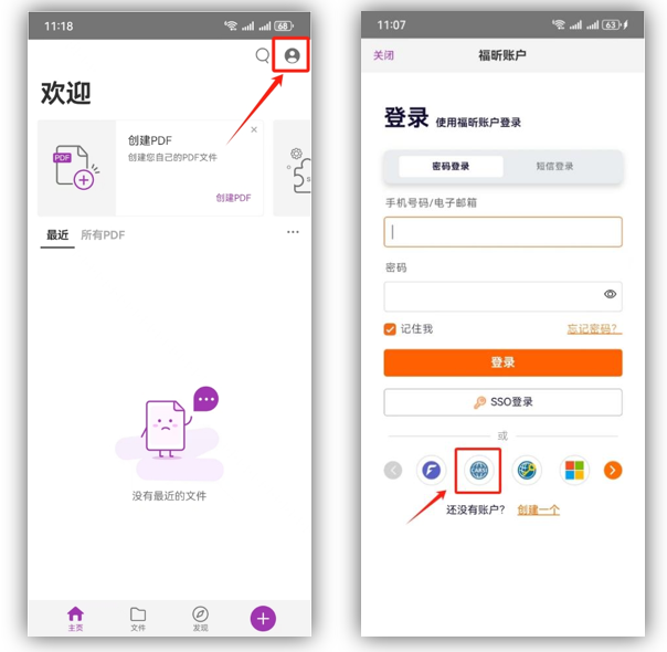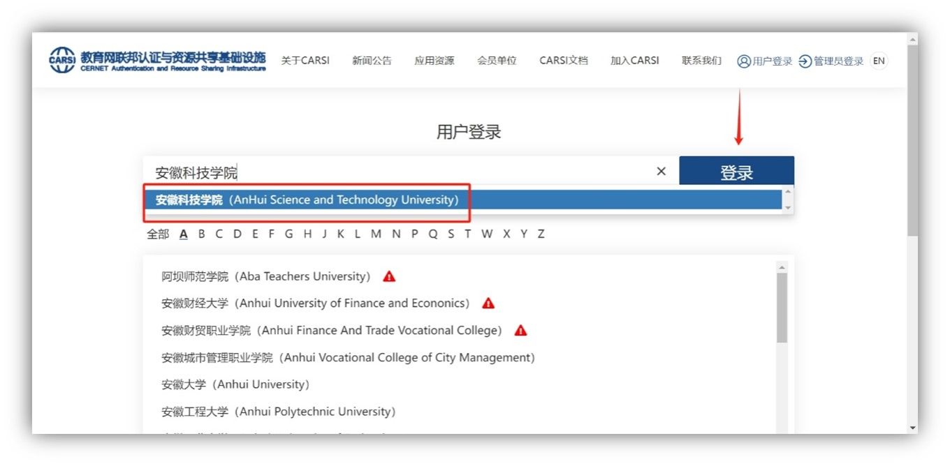 ①安装完成后打开APP,在右上角进入登录页,在登录页面选择“CARSI”登录;②输入所在学校名称,点击“登录”;