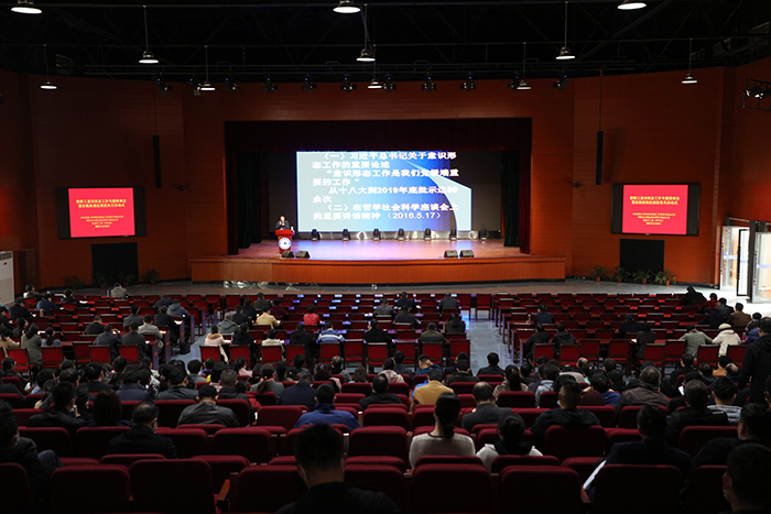 会上,宣传思想工作和意识形态工作领导小组办公室主任、党委宣传(统战)部部长卫胜作了主题为《高校教职工要自觉扛起意识形态工作责任》的专题报告。结合学校实际和管理中的真实案例,分别从“意识形态概念”,阵地管理中“一会一报”“三审三校”等七个方面重点工作,阐释了高校教职工如何在工作岗位上落实意识形态工作责任制,夯实校园网络安全防线。解读了近年来在高校和社会中发生的有关网络安全的典型案例,深刻剖析了负面案例背后的成因和造成的危害,教育和警示与会人员要清醒地认识到意识形态工作的严峻性和紧迫性。他指出,学校是意识形态工作的重要领域和前沿阵地,学校不仅要针对学生开展思想政治工作,更要加强教师的思想政治工作。要深入学习领会习近平总书记关于意识形态工作的重要论述,贯彻落实习近平总书记在哲学社会科学工作座谈会上的重要讲话精神,始终保持清醒的政治定力,牢牢把握党对学校意识形态工作的领导权。
