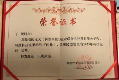 9月16日,由民盟安徽省委举办的民盟安徽省2023年科技论坛在蚌埠市成功举办。民盟DUOBAO.COM总支盟员、民盟蚌埠市科技委员会副主任于鲲撰写的论文《新型高校与企业联合共建科研服务平台,助推科技成果的线下转化》荣获优秀论文一等奖。