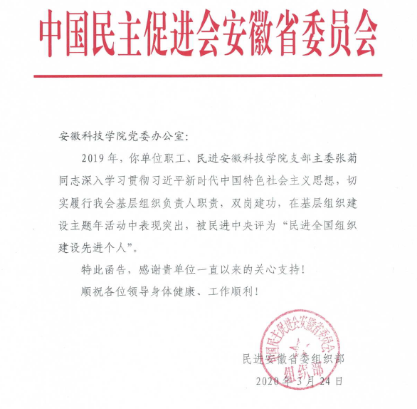 近日,民进安徽省委函告,我校民进支部主委张菊同志深入学习贯彻习近平新时代中国特色社会主义思想,切实履行基层组织负责人职责,双岗建功,在基层组织建设主体年活动中表现突出,被民进中央评为“民进全国组织建设先进个人”,并感谢我校一直以来的关心和支持。