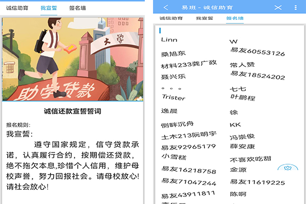 为增强大学生诚信做人、心怀感恩、勇担责任的优秀品质。5月11日至22日,学院开展易班“诚信还款”宣誓签名活动,发出“遵守国家规定,信守贷款承诺,认真履行合约,按期偿还贷款,绝不拖欠本息,珍惜个人信用,维护母校声誉,努力回报社会。请母校放心!请社会放心!”的倡议,易班“诚信还款”签名活动的开展,进一步增强大学生的诚信意识,全面推进诚信校园建设。
