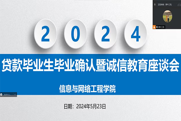 为了增强贷款毕业生的诚信还款意识,加强毕业生诚信感恩教育和文明教育。5月23日中午,信息与网络工程学院通过腾讯会议,召开2024届贷款毕业生毕业确认暨诚信感恩教育座谈会,会议由学院资助工作联系人许磊主持,2024届贷款毕业生参加会议。
