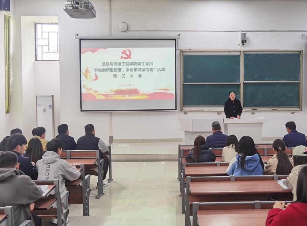 为贯彻落实习近平总书记在党史学习教育动员大会上的重要讲话精神,进一步加强学生党员教育,提高学生党员的创新素质和学习能力,发挥党员模范带头作用。3月31日下午,信息与网络工程学院于致知楼A111召开学生党员“争做创新型模范,争创学习型宿舍”(简称“双争”)活动动员大会。学院党委书记王振其、正处级组织员周向群、党委副书记韦乃学、各学生党支部书记及学生党员、入党积极分子参加此次动员大会,会议由王振其主持。