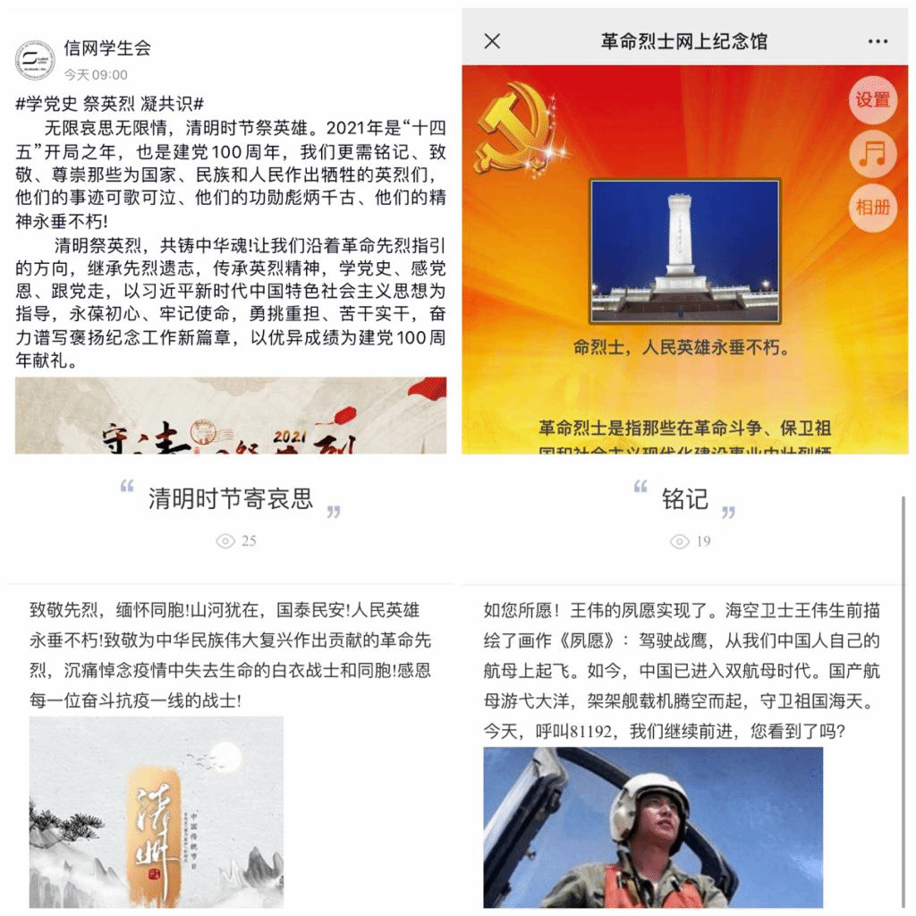线上通过在易班微社区、qq,微信等网络平台,发布致敬英烈相关的内容,分享英烈生平事迹,表达对英烈的崇敬之情。在烛光会微信公众号平台,开展网上祭扫活动,通过“献花”、“点烛”、“上香”等方式表达了对先烈的怀念与敬仰,在特殊时期给了同学们一个向英烈表达致敬的机会,激发了同学们的爱国热情,更用文明科学的方式的倡导了“移风易俗,文明祭祀”的新理念。