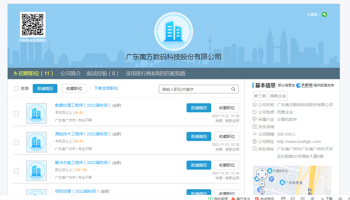广东南方数码科技股份有限公司(简称:南方数码,股票代码:835846)成立于2003年,总部位于广州,员工规模逾千人,业务覆盖全国,拥有八家分公司,是一家集数据、软件、服务于一体的中国领先的地理信息产业服务商、地理信息产业“百强企业”。具备国家信息产业部认定的“软件企业”、广东省认定的“高新技术企业”、“广州市重点软件企业”、“广东省优秀自主品牌”、测绘甲级资质、CMMI5级认证、系统集成二级资质、ISO9001:2008国际质量体系认证、地理信息产业优秀工程金奖(连续多年)、行业最佳雇主品牌等超全行业荣誉与资质。 公司全面面向数字城市/智慧城市,以数据为基础,以基础测绘、房产、国土、不动产、市政、规划等行业为核心发展地理信息产业,产品服务贯穿产业链。全国范围内,已有超千个政务管理系统稳定运行在各级政府和行业管理部门。