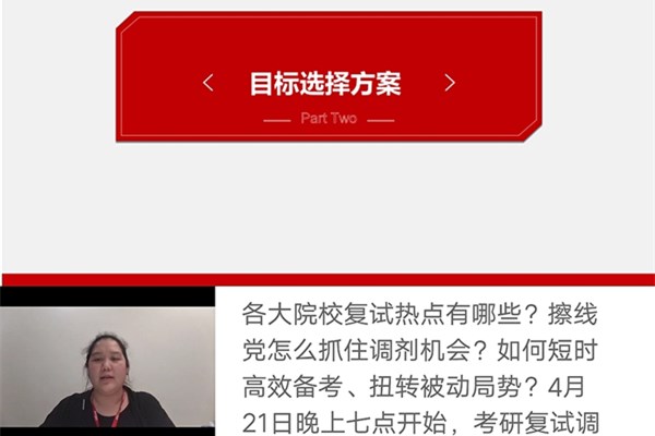 为进一步加强学院考生对复试流程及报考调剂的了解,4月21日晚,资源与环境学院举办考研复试线上答疑讲座。本次讲座邀请中公教育王成成担任主讲人,学院2020届考研学生参加此次线上讲座。