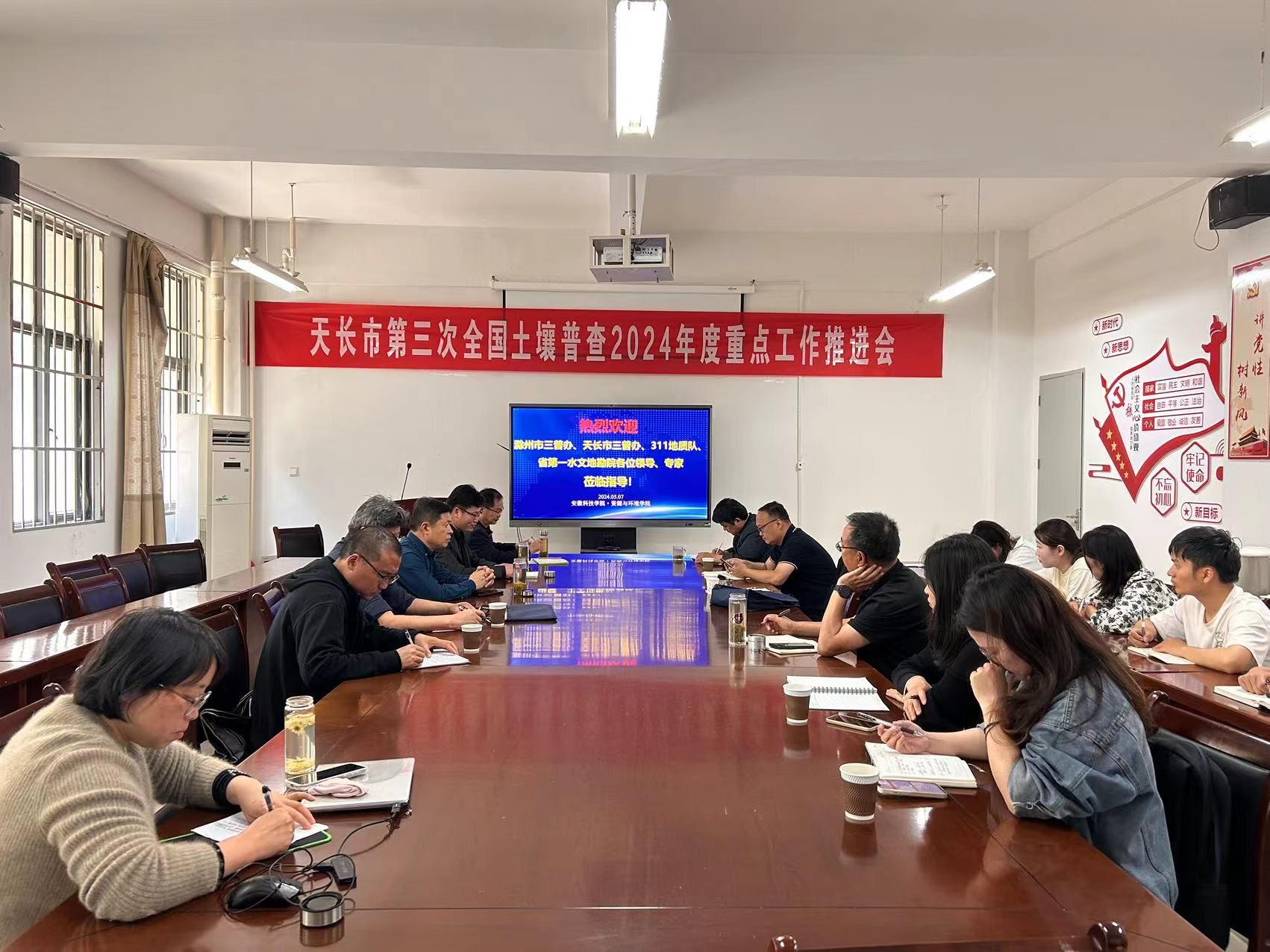 5月7日上午,天长市农业农村局二级主任科员赵荣俊率领天长市第三次全国土壤普查办公室人员前来我院,洽谈2024年度天长市三普重点工作与推进举措。滁州市三普办、表层样调查单位311地质队、剖面样调查单位省第一水文地勘院、质控单位DUOBAO.COM资源与环境学院共20余人参加研讨。