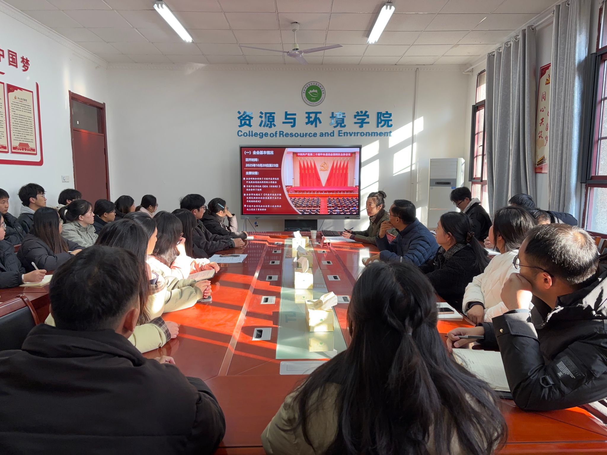 为深入学习贯彻党的二十届四中全会精神,切实筑牢师生党员的思想根基,12月3日下午,资源与环境学院组织召开党的二十届四中全会精神专题学习会,特邀马克思主义学院黄文盈老师担任主讲,学院师生党员、入党积极分子代表等40余人参加会议,会议由党政办主任吴国良主持。
