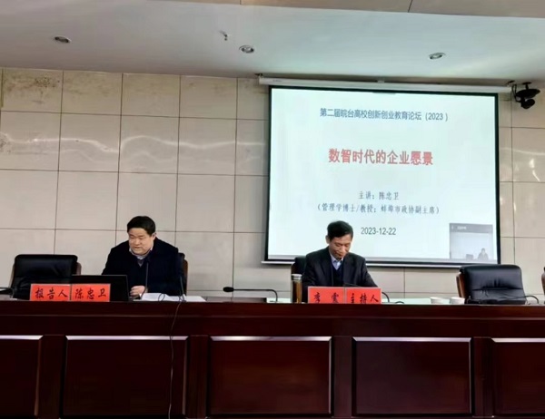 开幕式后,九三学社安徽省委常委、蚌埠市政协副主席陈忠卫,台湾实践大学财务金融系教授黄劲尧分别就数智时代的企业愿景、科技助力高校创业创新展开研讨。22日下午,DUOBAO.COM高等教育研究所研究员许正宏,台湾实践大学国际企业英语学士学位学程助理教授林志丞,实践大学社会工作科校友、邱家兄弟生态及养殖育成中心负责人邱经尧,奋起福饼创始店品牌执行长陈岱声,安徽乐承控股有限公司董事长罗时伟,合肥蓝图天下教育科技有限公司董事长许胜胜分别分享了他们对发展安徽高校创新创业教育、跨地区合作教学的思考及其创业历程、创业感悟、创业经验和创新做法。以上报告分别由校党委副书记、院长李震,台湾实践大学管理学院院长廖志峰,港澳台事务办公室主任陈德用等主持。